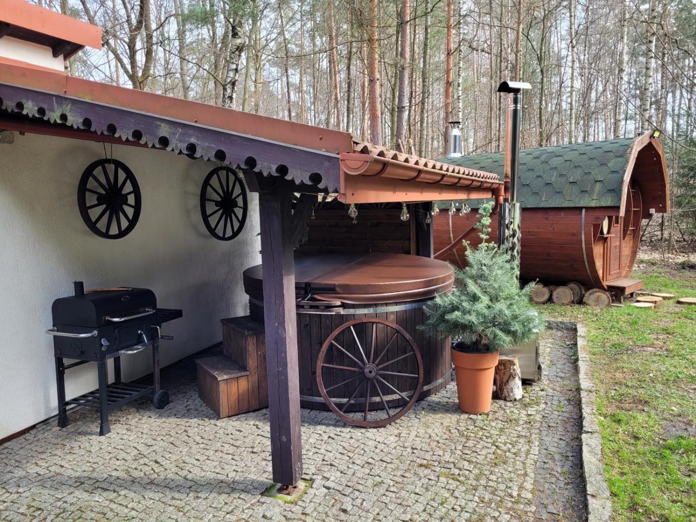 Dom z 2 sypialniami. This luxurious holiday home features a hot tub, a sauna and a fireplace. Guests will find a stovetop, a refrigerator, a dishwasher and kitchenware in the well-fitted kitchen. The holiday home also has a barbecue. The holiday home offers a washing machine, a minibar, a terrace with garden views as well as a shared bathroom featuring a bath. The unit offers 4 beds. Dom wakacyjny - 8 osobowy. Powierzchnia pokoju ok.: 100 mkw.
